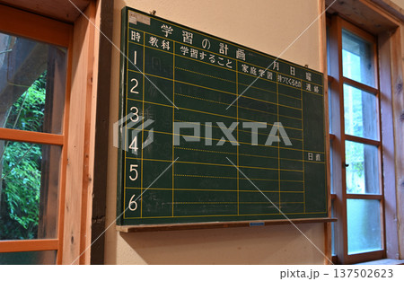 ノスタルジックな木造校舎の教室に掲げられた学習計画の黒板