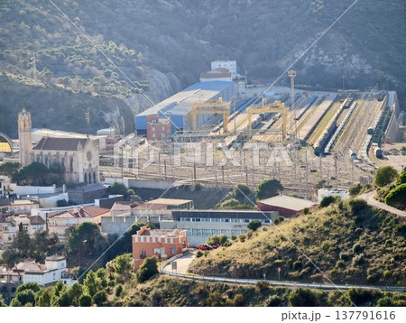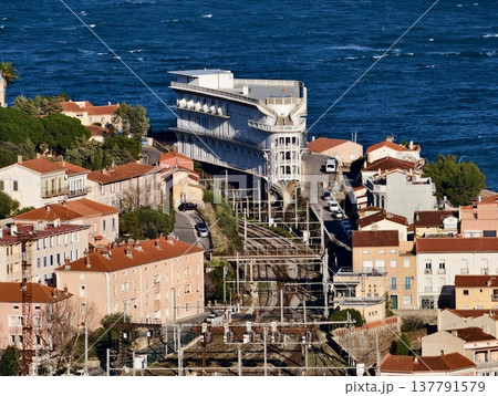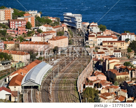 Train Progresses Past Colorful Rooftops Towards Bustling Seaside Terminal Under Bright Sunny Sky