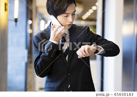 オフィスで時間を気にしながら電話するスーツ姿のビジネスマン