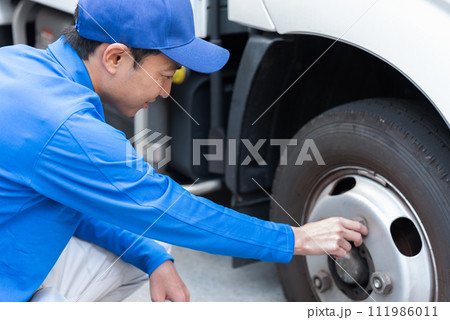 タイヤの運行前確認を行うトラックドライバー