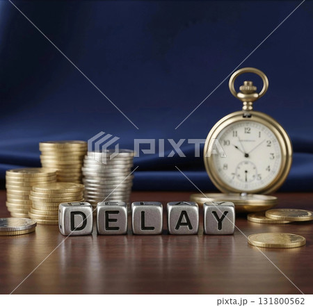 Delay word cubes, money stacks, and a pocket watch on a wooden table