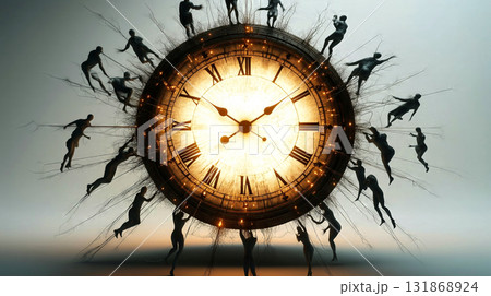 People hanging from a giant clock representing time management
