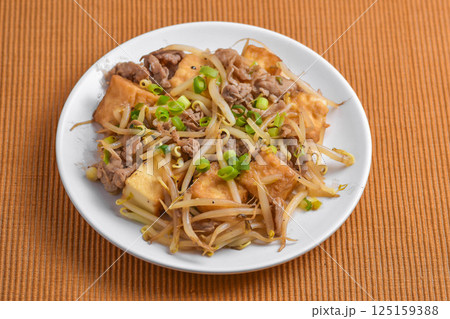 厚揚げと豚肉とモヤシのオイスターソース炒め