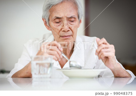 Sick asian senior woman suffering from anorexia,bored with meal,eating less food or discomfort in swallowing,disease of Dysphagia,Old elderly patient having lack of appetite,nutrition and health care