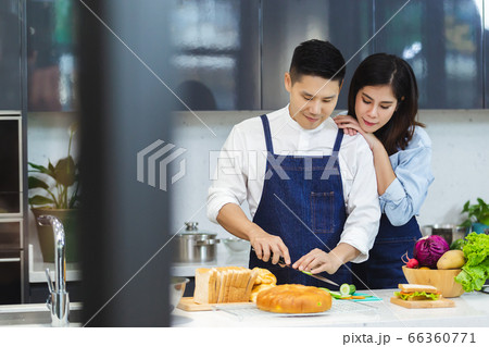 man and woman, happy asian couple chef cooking together in kitchen at home.