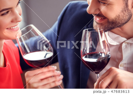Young couple on date in restaurant sitting drinking wine flirting cheerful close-up