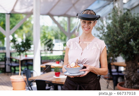 Waitress with protective face shield serving customers outdoors on terrace restaurant.