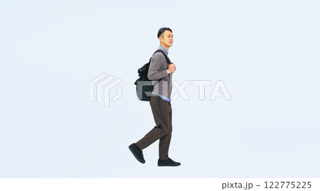 リュックを背負って歩くカジュアルウェアのミドル男性の全身写真