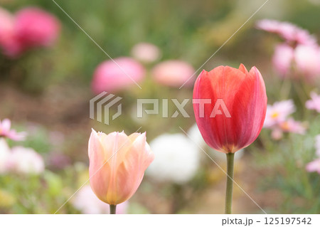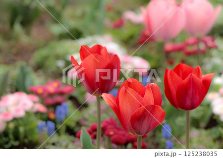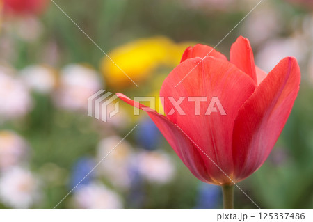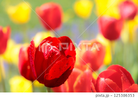 春の陽光を浴びて色とりどりに輝くチューリップ