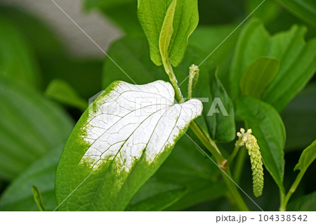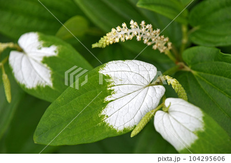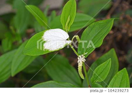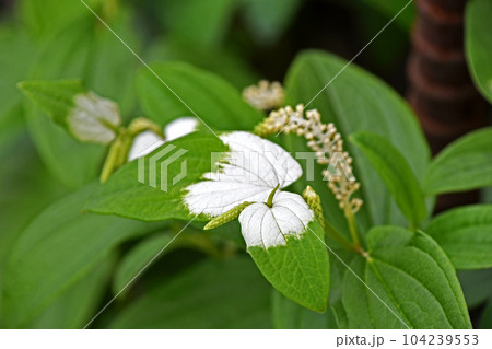 梅雨の頃に咲くハンゲショウの白い葉っぱと花