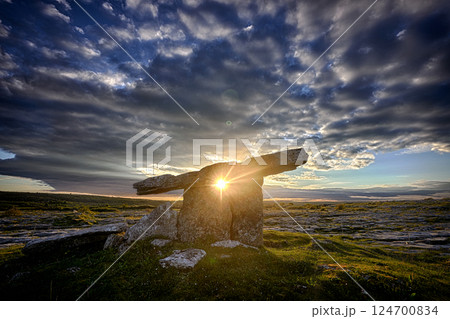 Sunset over Poulnabrone dolmen an ancient portal tomb in the Burren, County Clare, in the west of Ireland.