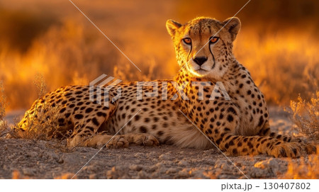 Cheetah resting on sunlit savannah at sunset with golden hues and serene expression