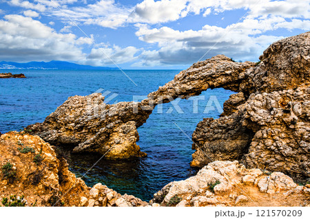 Spectacular sunset at Pont den Gil (Cala Corbetar) in Ciutadella, Menorca, Balearic Islands. Peculiar natural formation in the form of an arch
