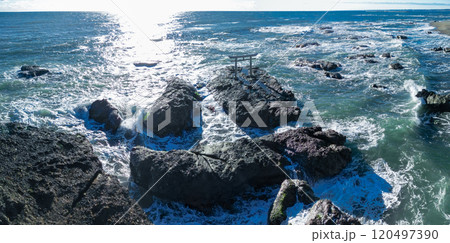 空撮「茨城県」海岸に佇む磯前神社の鳥居 大洗磯前神社