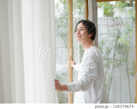 Rear view of happiness Asian woman open curtains for looking beautiful view outside her room.