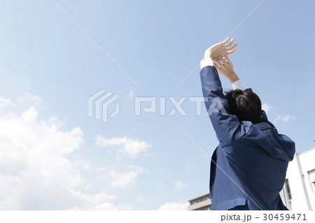 若い男性と青空後ろ姿背伸び
