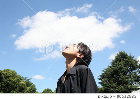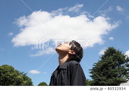 青空と天を仰ぐ若い真顔の男性