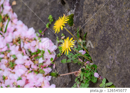 タンポポと桜の花びら