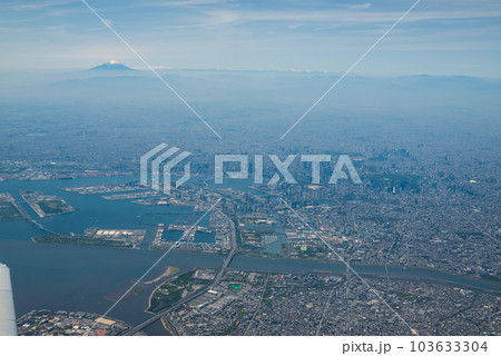 空から東京港越しに富士山を望む