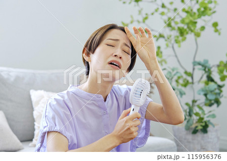 蒸し暑いリビングで携帯扇風機を使う女性