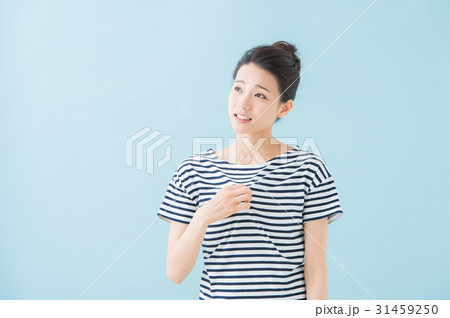 夏 暑い 女性(青背景)