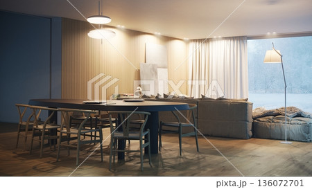 Modern interior with dining table and sofa. Winter snow view through window. 3D render
