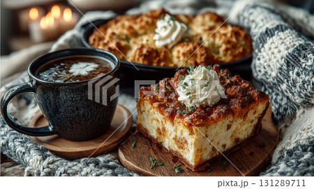 Comfort food concept. Savory bread pudding with herbs and whipped topping served with cup of coffee on cozy blanket