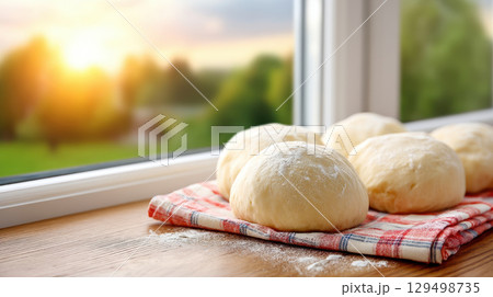 Small dough balls resting on cloth near window with sunlight create warm and cozy atmosphere for small business bakery