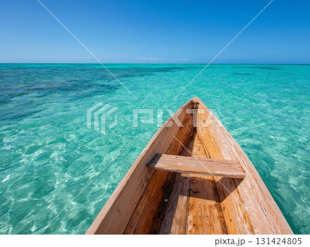 Wooden boat glides on turquoise ocean to shore with dense trees. Serene sea and cloudy sky give peaceful travel experience.