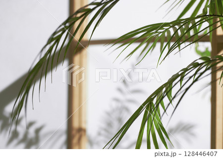 Soft sunlight through wooden windows, shadows, green leaves and texture of white walls.