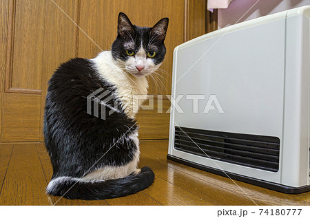 ガスファンヒーターの前で暖をとるネコ