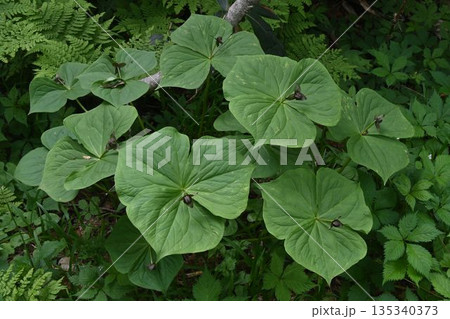 信州栂池自然園で見た大きな三枚の葉の中心に咲く小さな暗紫色の花が可愛いエンレイソウの群生
