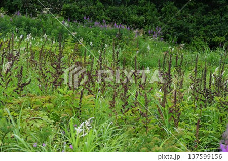 信州白馬五竜高山植物園で見た暗紫色の花の円錐花序が並んで立っている姿がユニークなシュロソウの群生