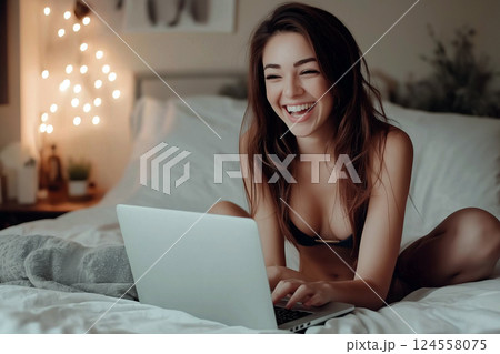 Sexy young woman in lingerie with a laptop on the bed broadcasts online for subscribers. Working in adult entertainment industry from home remotely. Sex webcam model, online dating app