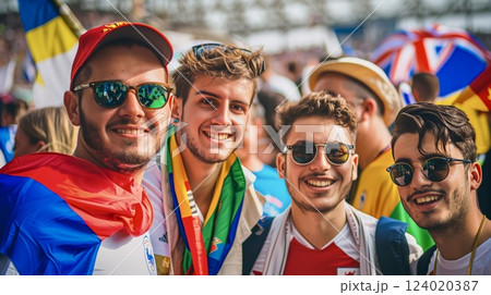 Friends celebrating at a vibrant soccer match with flags, enjoying the festive atmosphere on a sunny day