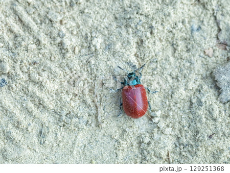 Chrysomela sp. brown bug crawling on white sand, dorsal view