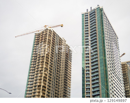 Construction of a high-rise building. Skyscraper glazing. Scaffolding. Overcast weather. Cloudy. Construction zone.