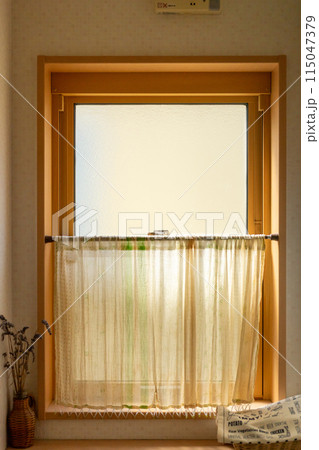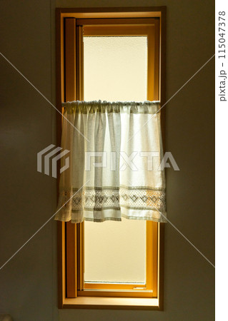 すりガラスの上げ下げ窓にカフェカーテンをつけたトイレの窓