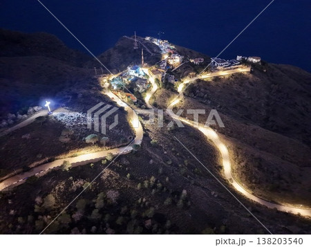 Elevated vantage point revealing peaceful journey through illuminated winding mountain roads at night