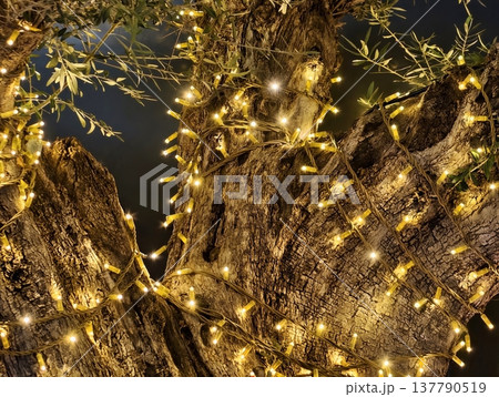 Cozy Nighttime Setting With Gnarled Tree Illuminated By Tiny Fairy Bulbs Along Peaceful Pathway