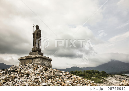 青森県霊場恐山の観音像たちモノクロ