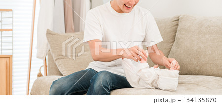 ソファーで赤ちゃんの世話をするパパ・父親・男性・夫・旦那(子育て・育児・イクメン・男性育休)
