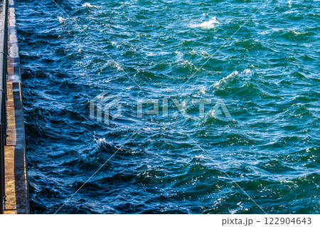 日本の横浜都市景観 強風の土煙で茶色く染まる横浜の空や大きく波打つ山下公園前の海などを望む=13日