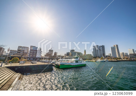 日本の横浜都市景観強風で(土煙に覆われた横浜の街や)滲む太陽、海面には美しい波紋…=13日