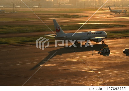 夕日でシルエットに浮かぶ旅客機 羽田空港の夕景