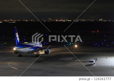 夜の羽田空港 夜間飛行に向かう旅客機