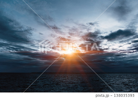 Dark sea black sky cloudy with a bright light sun for last hope, new hope concept.