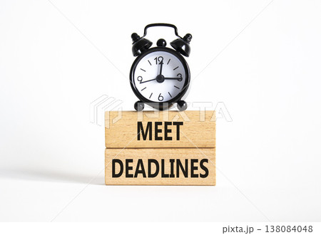 Meet Deadlines symbol. Concept word Meet Deadlines on wooden blocks. Beautiful white background with alarm clock. Business and Meet Deadlines concept. Copy space