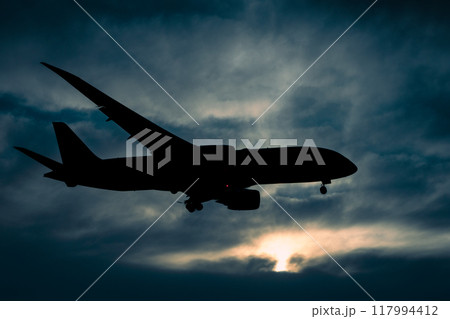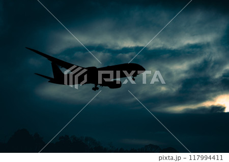 夕景を背景に最終進入を行う飛行機