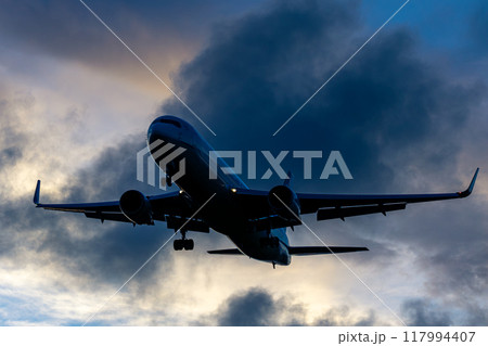 夕暮れに着陸する飛行機